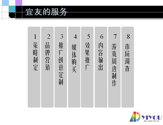 成都宜友这一年合作的业务中,强IP游戏也逐步增多,《NBA梦之队》,《变形金刚:崛起》、《航海王 启航》均一手掌握。同时,公司主营业务拓展至媒体投票、新闻撰写\发布、视频推荐、第三方口碑炒作等,为客户提供全方位专业服务。成都宜友凭借着在游戏圈摸爬滚打多年的资源优势,及“靠谱”不坑爹的作风,越来越受到国内一哥一姐的青睐,为多种多样一线厂商提供软性全案服务, 盛大今年的重点项目《最终幻想14》、《地城之光》,暴雪大作《风暴英雄》等,都与成都宜友展开长期深入的合作。